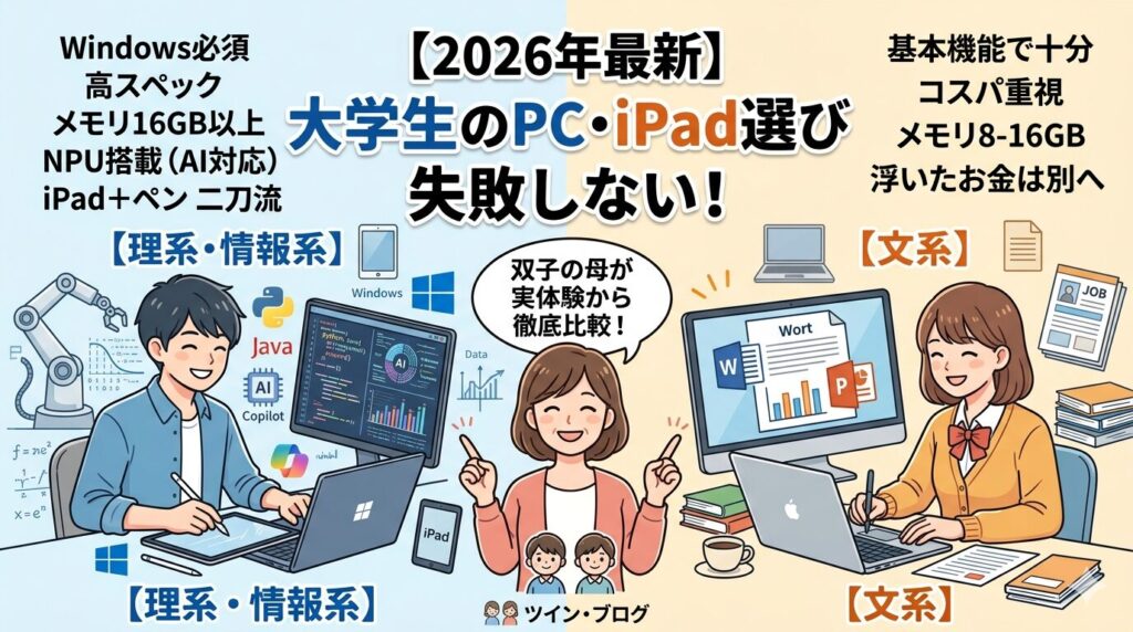 【2026年最新】大学生のPC・iPad選びで失敗しない!理系(情報)と文系で違う「本当に必要なスペック」を双子の母が徹底比較