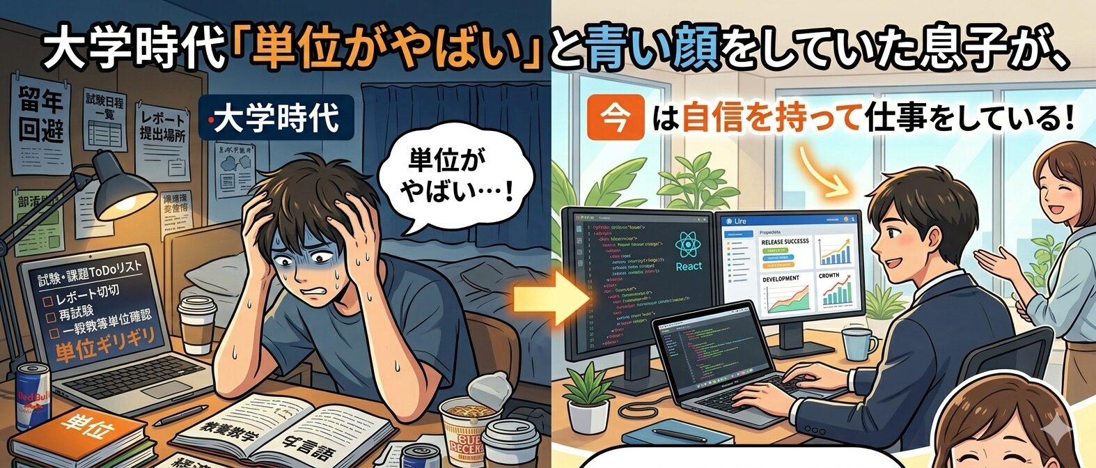 情報系に進んだ太郎を見ていて感じるのは、「学んだことが仕事に直結している」という実感です。大学で苦しんだプログラミングや情報理論が、今の仕事の土台になっています。