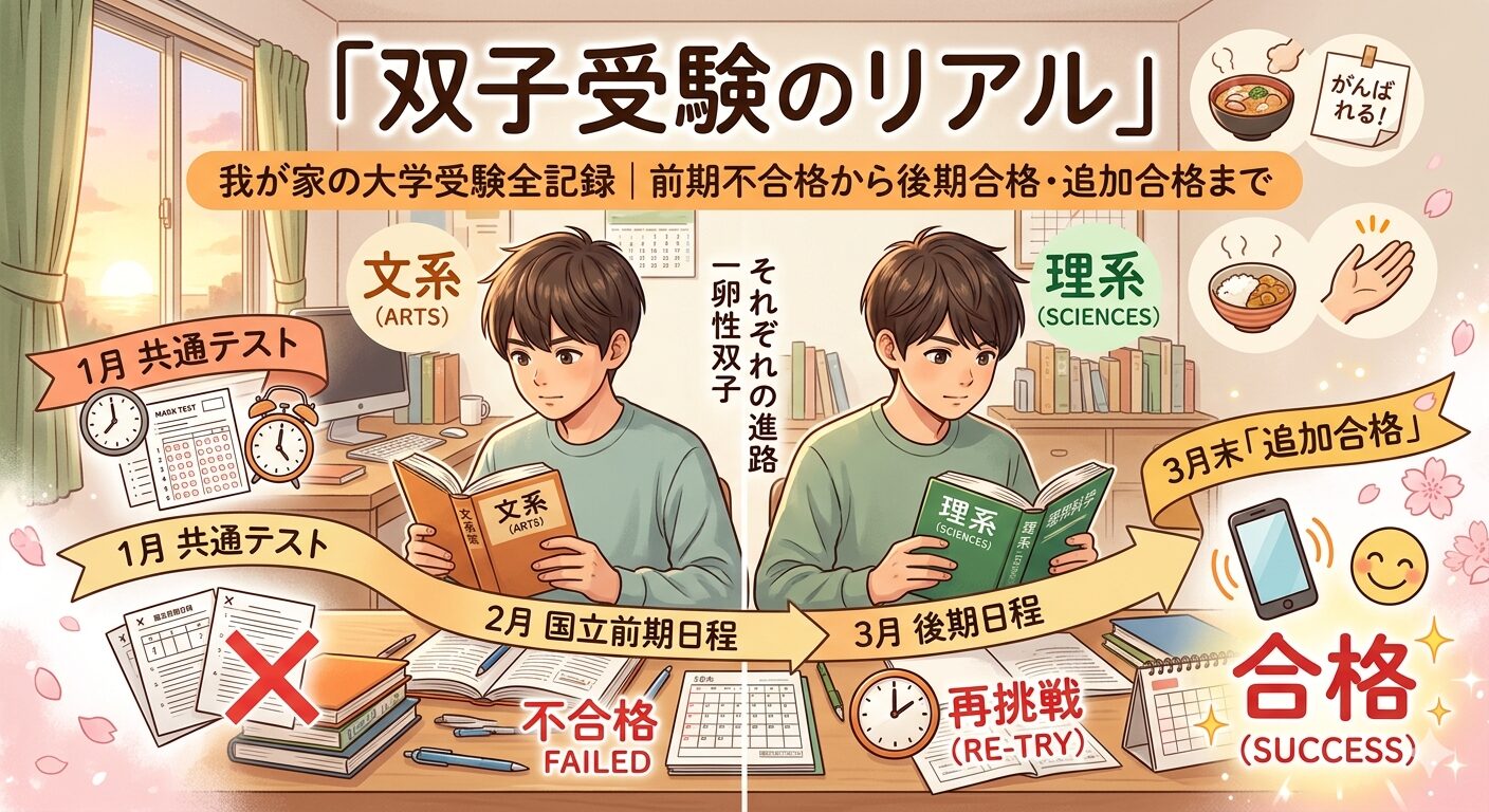 この記事では、我が家の大学受験の流れを時系列でまとめた「双子受験の完全記録」として紹介します。