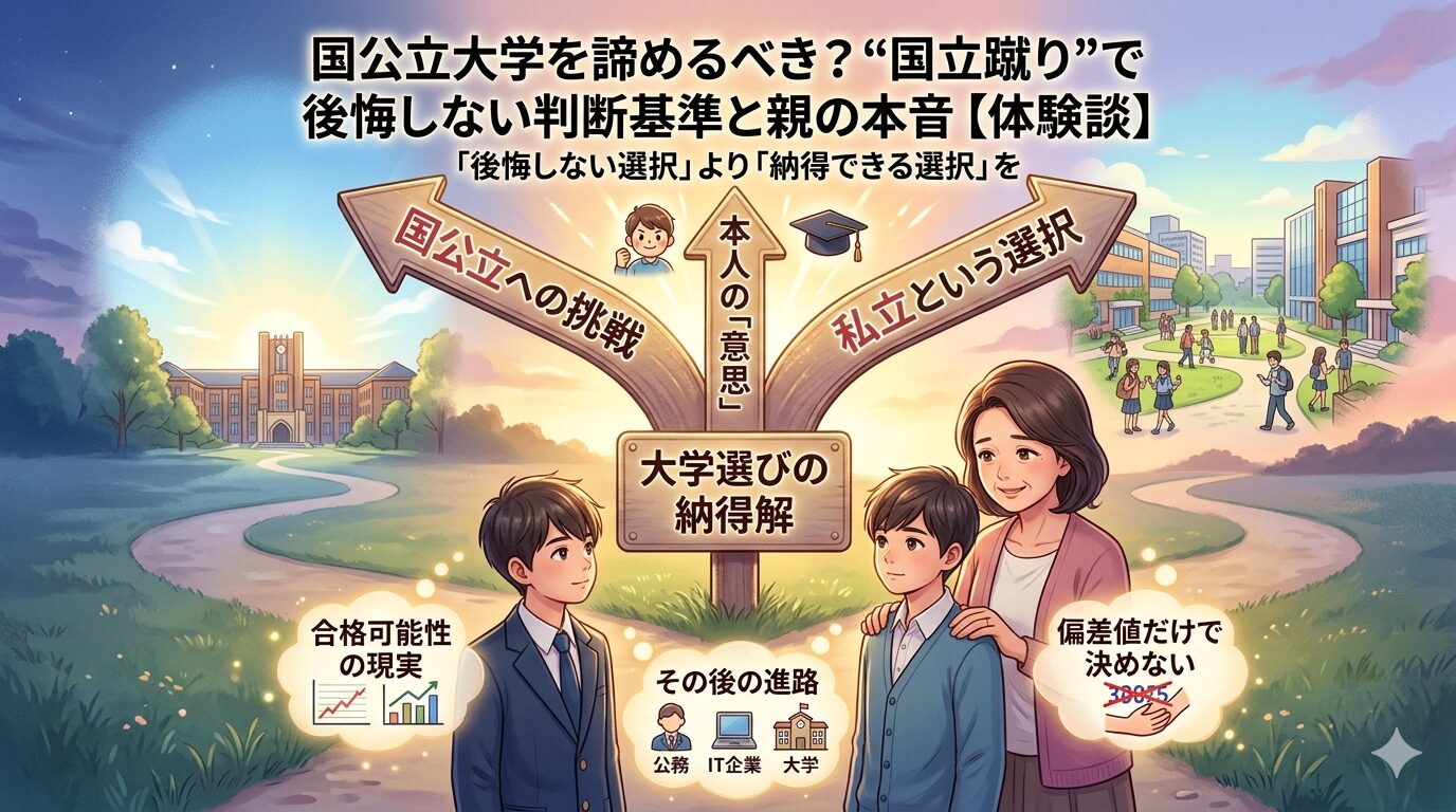 わが家も、双子で大学受験を経験する中で「このまま国公立を目指すべきか」という判断に何度も向き合いました。