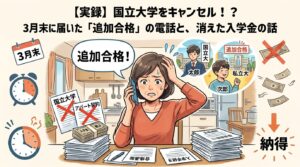 【実録】国立大学をキャンセル!?3月末に届いた「追加合格」の電話と、消えた入学金の話 「合格おめでとう!」と手放しで喜んでいたのも束の間。 我が家の双子受験、最後の最後に「双子妊娠以来の想定外」が待ち受けていました。 国立大学への入学手続きを済...