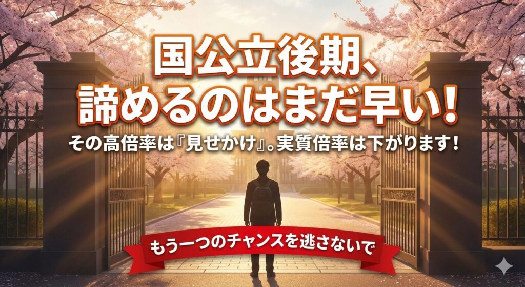 \ 出願締め切り前にチェック! / 「国公立後期は無理ゲー」という誤解を解く3つのポイント: 実質倍率はガクッと下がる(前期合格者は受験しません) 当日の相性で一発逆転がある(最後まで何が起こるか不明) 「出さない後悔」が一番の損失(息子2人の...