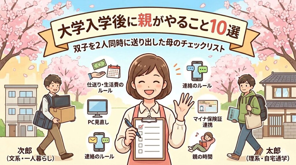 「合格おめでとう」から数週間。入学式も終わり、子どもが大学生活を始めた今、親として何をすればいいのか迷っていませんか? 我が家は双子が同じ年に同時に大学生になりました。太郎(理系・一人暮らし)と次郎(文系・自宅通学)、全く違う2人の4月を同...